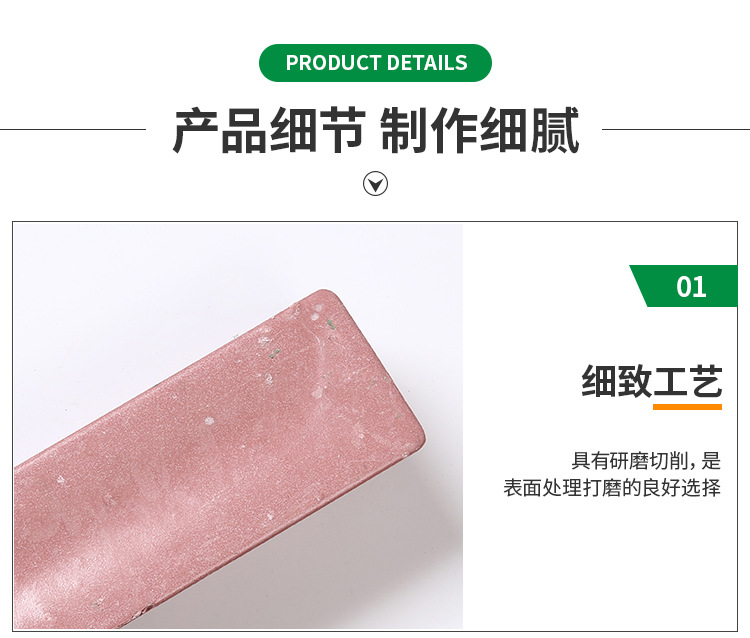 適用于一般鋼材,如不銹鋼、不銹鐵、鐵、銅、鋁等金屬進行中至精細研磨。此產品對工件的磨削力與打磨后工件的光亮度兼顧得比較好。能撤底去除工件表面上的砂眼、氧化皮等,使工件表面平滑如鏡,并產生優(yōu)良的光澤度。現(xiàn)時各廠家在不銹鋼餐具、廚具、刀具、管材、表帶等的中至精細研磨方面大量選用此產品。通常配合麻輪使用。