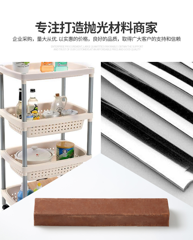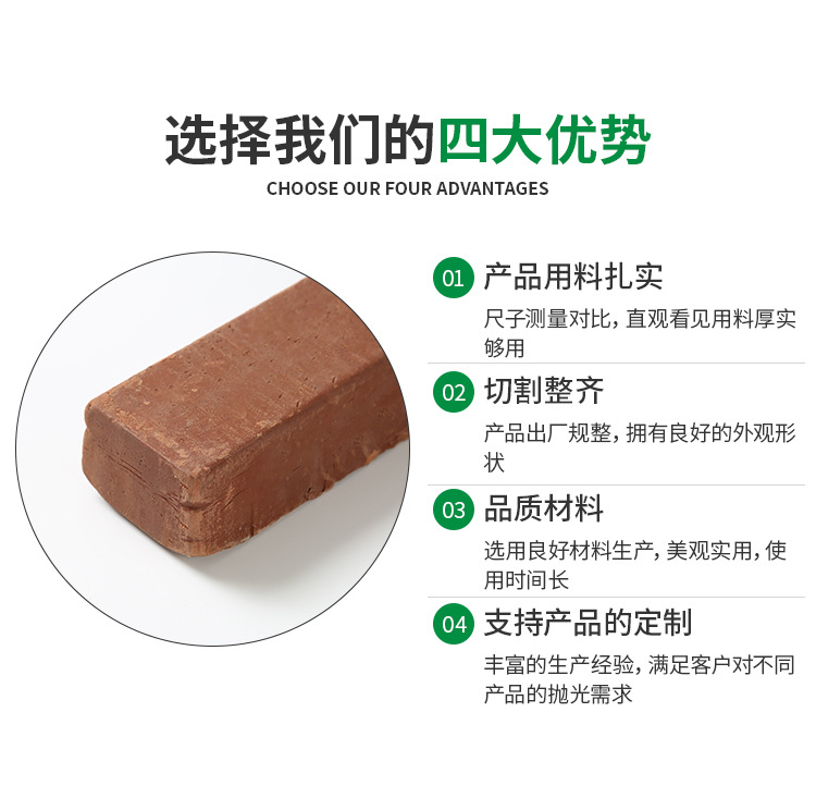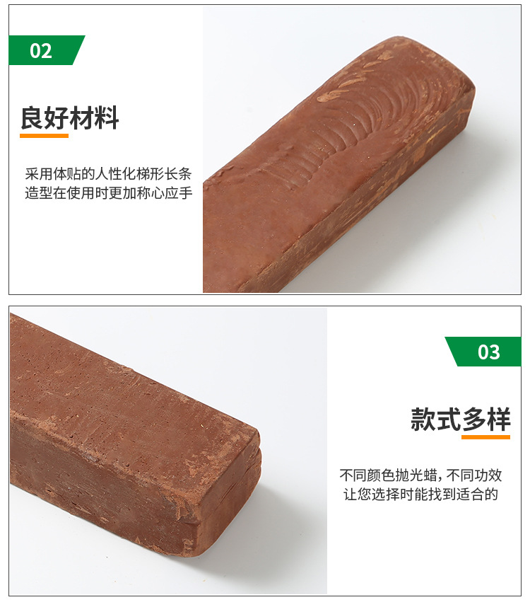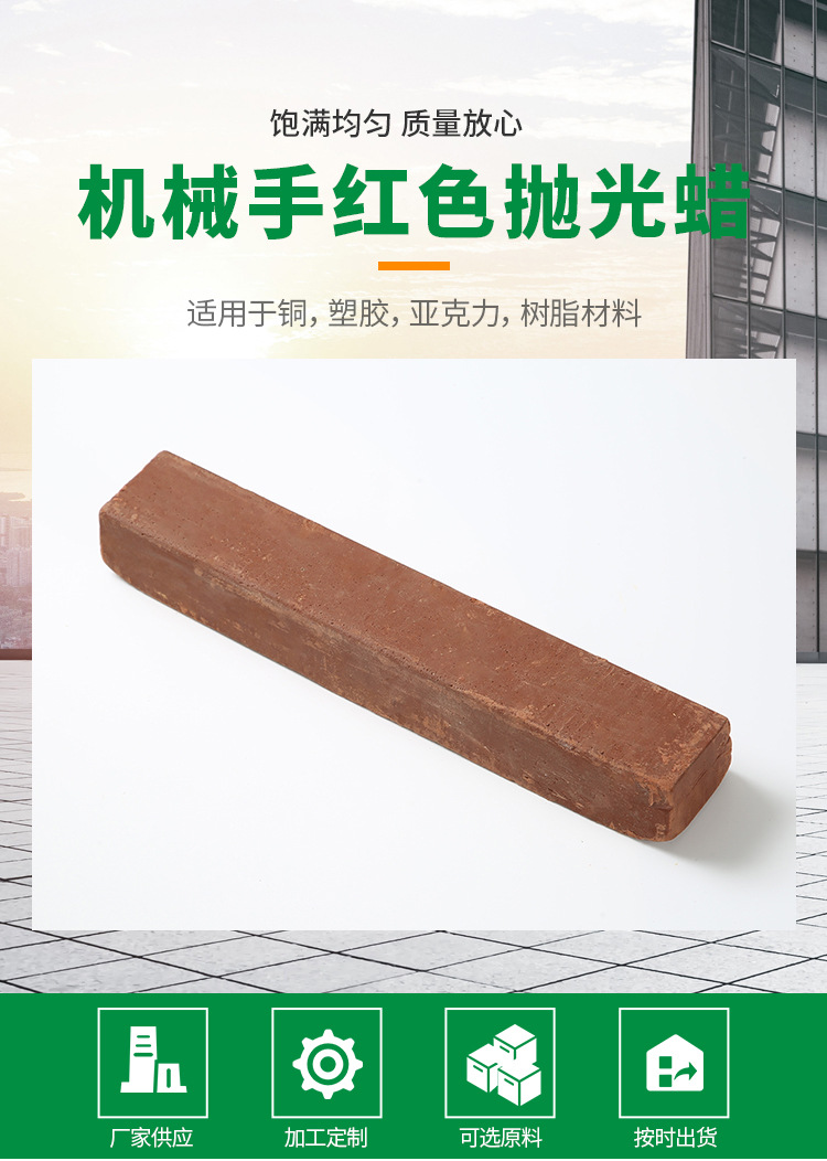華銘機械手紅色拋光蠟(臘)與布輪配合使用,適合任何材質,有著出光快,可以達到鏡面效果,是華銘目前較好的一款產品。采用體貼的人性化梯形長條造型在使用時更加稱心應手,款式多樣不同顏色拋光蠟,不同功效讓您選擇時能找到適合的